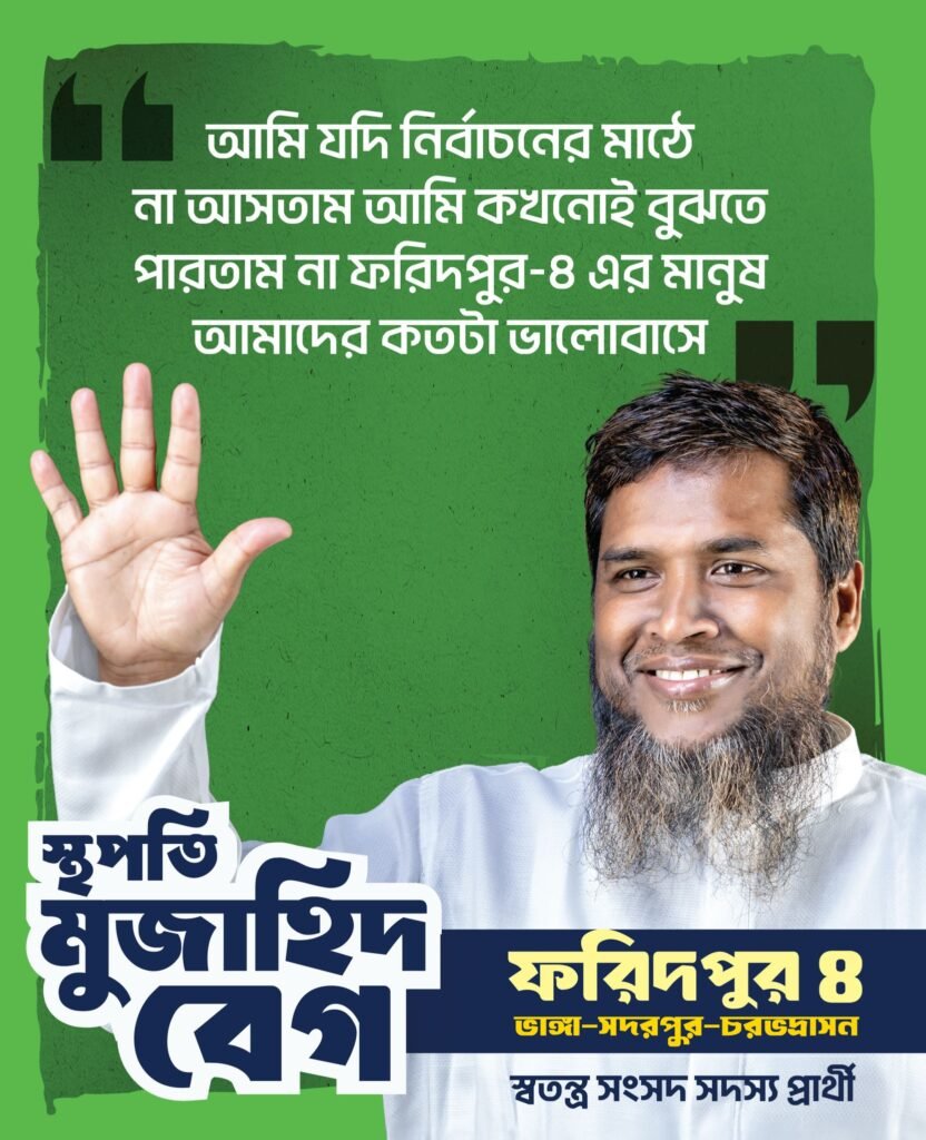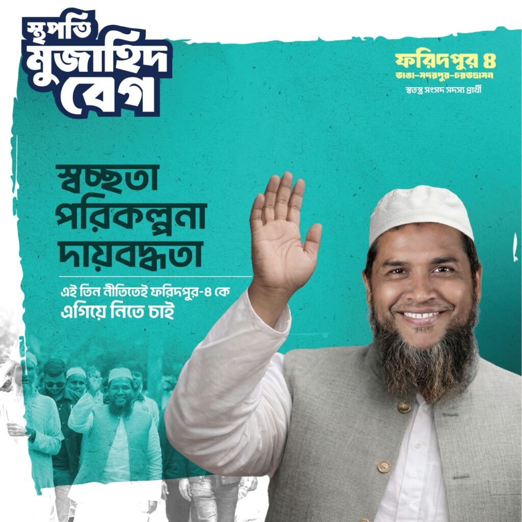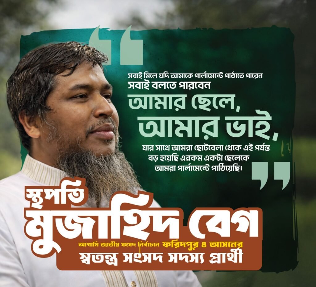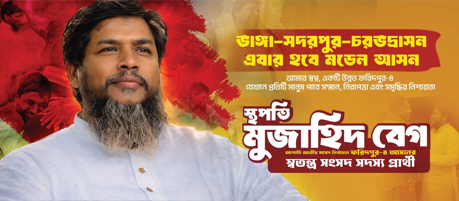 স্থপতি মুজাহিদ বেগ একজন সময় সচেতন, জনবান্ধব ও সৃজনশীল নেতৃত্বের প্রতীক। পেশাগত জীবনে একজন গুণী স্থপতি হলেও, তার হৃদয়ের কেন্দ্রবিন্দুতে আছে এলাকার সাধারণ মানুষের উন্নয়ন। ফরিদপুর-৪ আসনের মানুষের সুখ-দুঃখে তিনি এবং বেগ পরিবার সবসময় পাশে থেকেছেন একজন অভিভাবকের মতো।