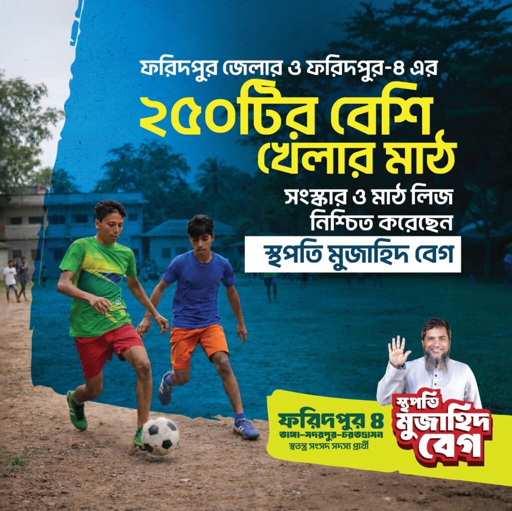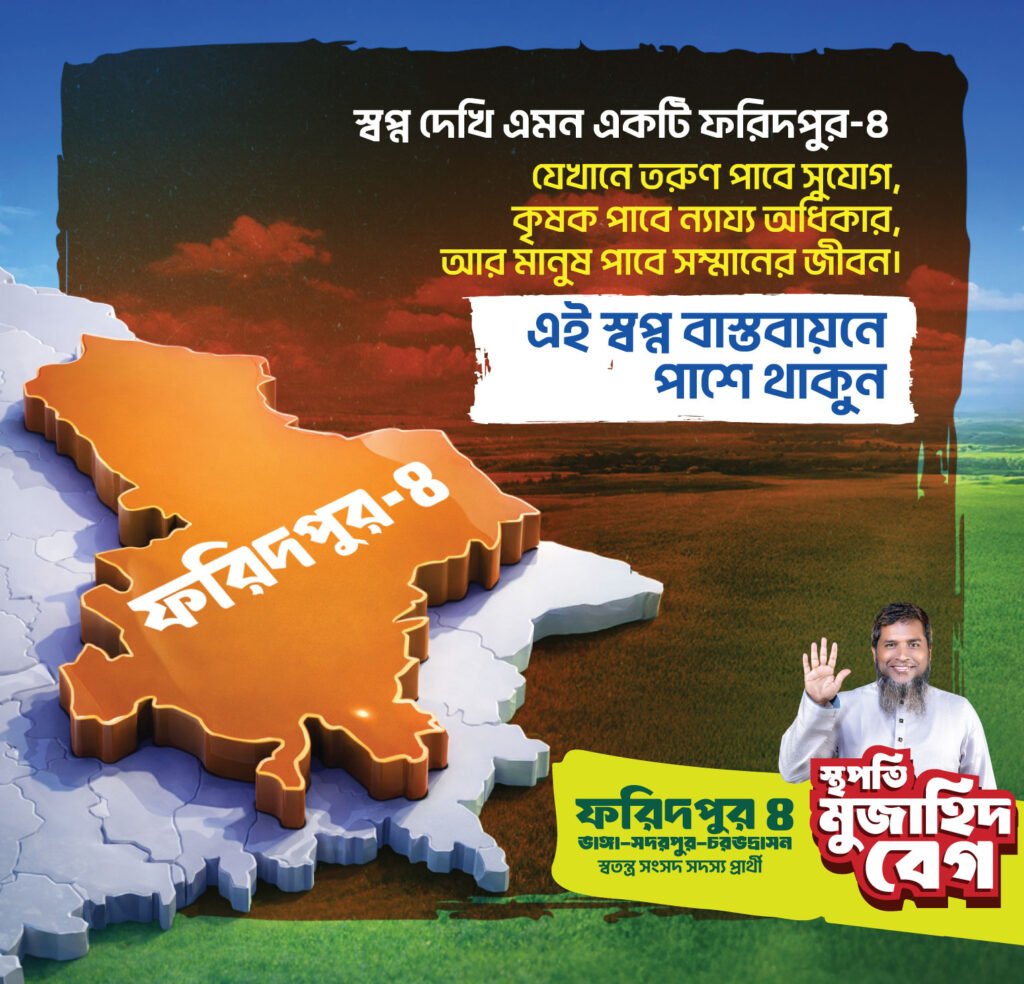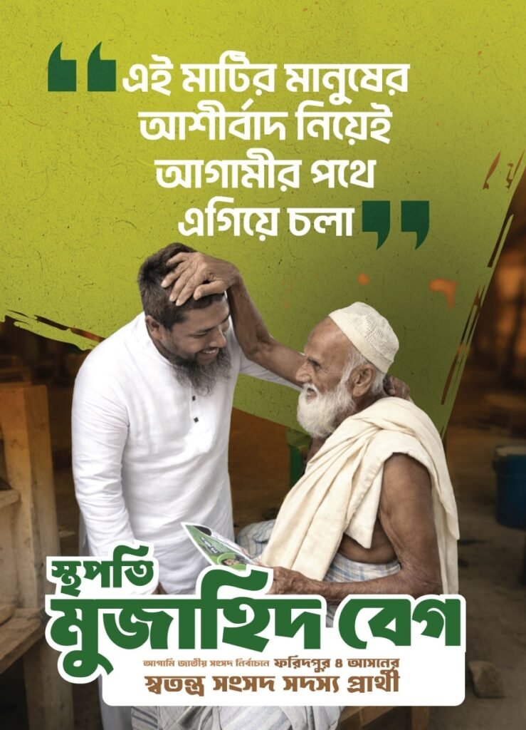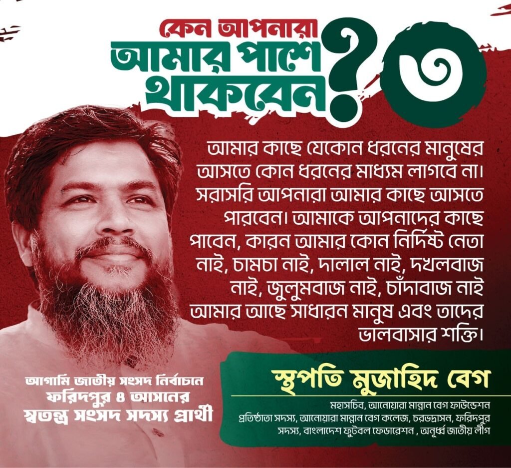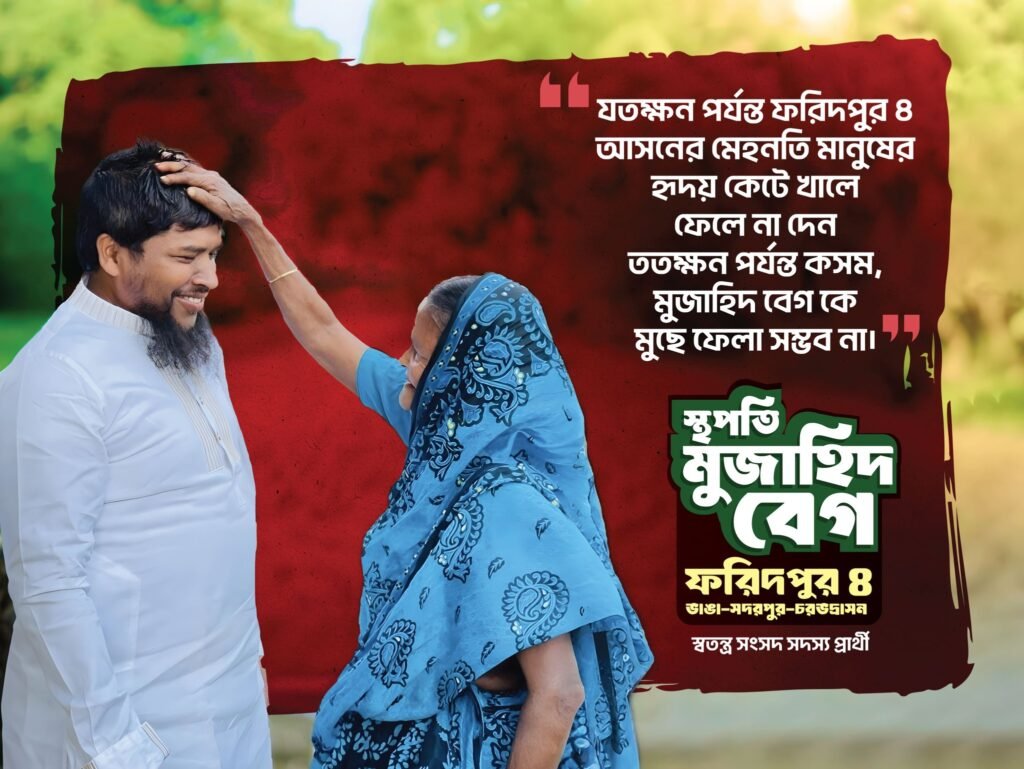 স্থপতি মুজাহিদ বেগ একজন সময় সচেতন, জনবান্ধব ও সৃজনশীল নেতৃত্বের প্রতীক। পেশাগত জীবনে একজন গুণী স্থপতি হলেও, তার হৃদয়ের কেন্দ্রবিন্দুতে আছে এলাকার সাধারণ মানুষের উন্নয়ন। ফরিদপুর-৪ আসনের মানুষের সুখ-দুঃখে তিনি এবং বেগ পরিবার সবসময় পাশে থেকেছেন একজন অভিভাবকের মতো।