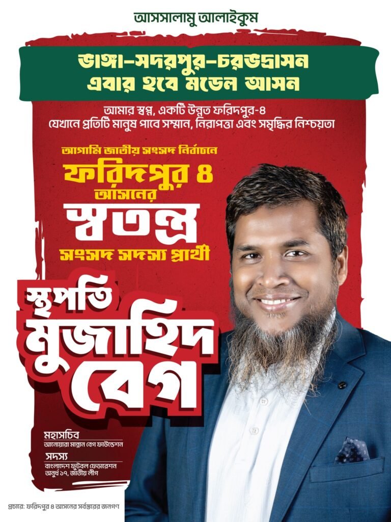স্থপতি মুজাহিদ বেগ একজন সময় সচেতন, জনবান্ধব ও সৃজনশীল নেতৃত্বের প্রতীক। পেশাগত জীবনে একজন গুণী স্থপতি হলেও, তার হৃদয়ের কেন্দ্রবিন্দুতে আছে এলাকার সাধারণ মানুষের উন্নয়ন। ফরিদপুর-৪ আসনের মানুষের সুখ-দুঃখে তিনি এবং বেগ পরিবার সবসময় পাশে থেকেছেন একজন অভিভাবকের মতো।